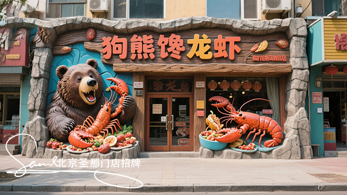 項目描述:門吊招牌以“熊霸的深海盛宴”為核心理念,顛覆傳統海鮮店形象,打造狗熊劫持龍蝦寶藏的奇幻場景,引發強社交傳播。