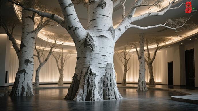 雅境與奢感共生!為財(cái)富公館打造的室內(nèi)仿真白樺樹