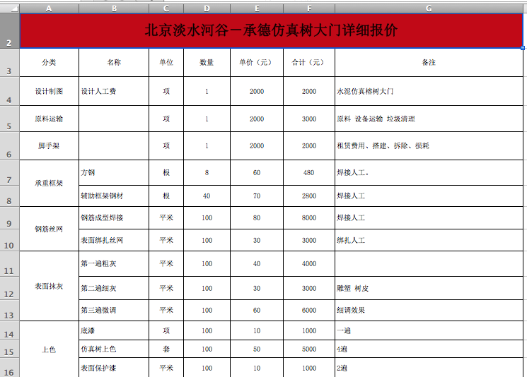 項目描述:仿真樹大門詳細報價按照整個仿真樹大門所用人、材、機的方式報價。其中把材料中的鋼材、水泥、顏色等進行詳細等劃分,細致到每棵仿真樹大門的每個細節(jié)所用的人工、材料等,方便以后客戶及同行使用。