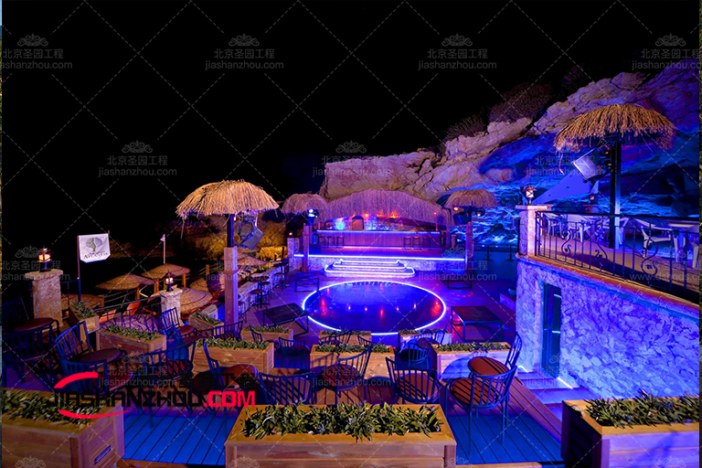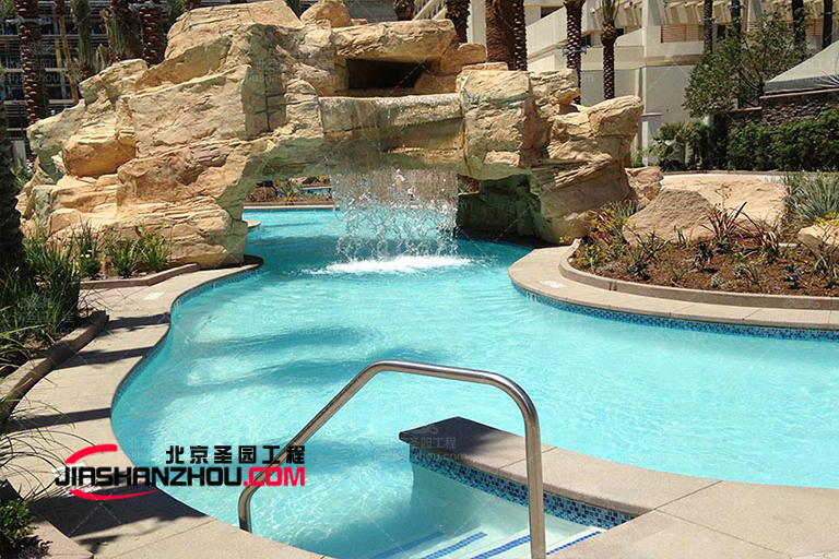 水泥假山設計重點,空間及造型搭配。水泥假山回歸自然的室內外設計。吊燈、水泥假山以及落地窗,形成了過渡柔和的燈光層次,柔軟的織物紋理、點綴的綠植、明亮水泥假山,營造出溫暖舒適的庭院氛圍感。白藍拼接窗簾,融入水泥假山、植物圖案,中古家具的質感,優雅的造型設計,將空間的韻味展現,從天花到地板再到水泥假山整體,色調濃淡依次遞進。