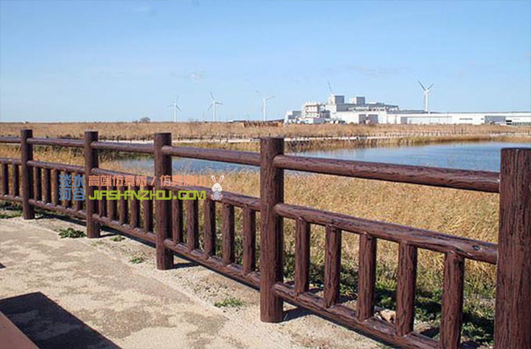 北京廠家為使客戶能簡單區分繁雜的仿木欄桿外型,采用象形命名的方法,把兩根立柱間有三根橫梁、五根豎梁的仿木欄桿命名為三段五豎圓形仿木欄桿。